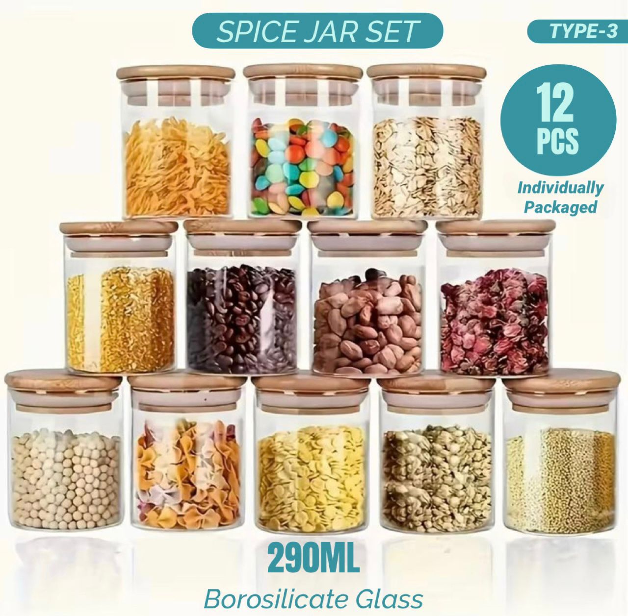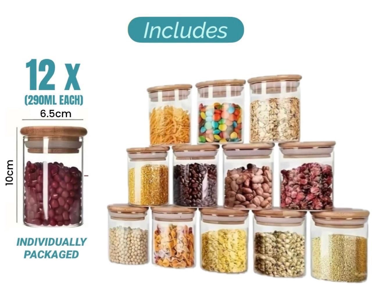 This is a set of 12 round glass storage jars, each with a capacity of 300ml and a diameter of approximately 6.5 cm. The jars come with airtight bamboo lids that help preserve freshness and prevent moisture from entering.