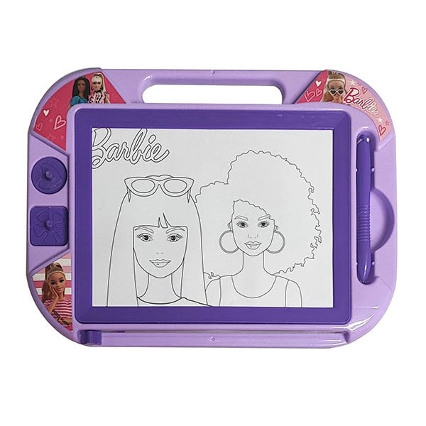 This is a Barbie-themed magnetic drawing board designed for children. It features a purple frame with Barbie graphics and branding, along with a handle for easy carrying. The central drawing area allows kids to create images using the included magnetic stylus, and the drawings can be erased by sliding the eraser bar across the board.