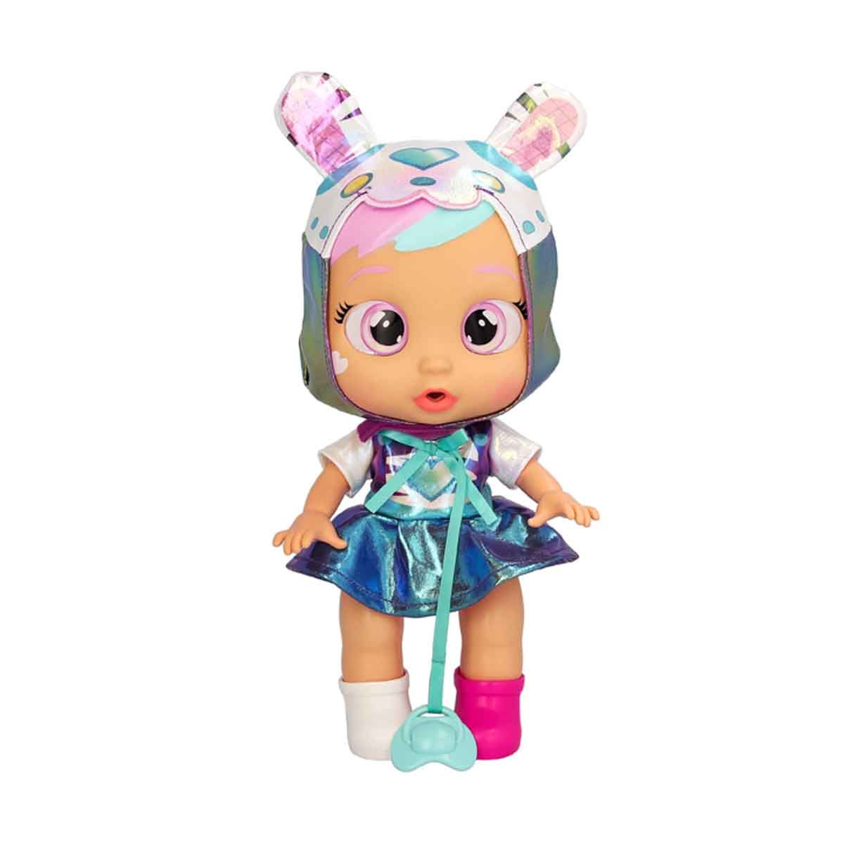 Star Jane love her pacifier. When you take it out from her mouth, she will cry tears tears and her eyes will light up with stars. Put her pacifier on again to make her stop from crying. She comes with an iridescent dress, a pair of shoes, a matching pacifier and a baby bottle. Starry eyes light up while she crying with real tears and baby sounds