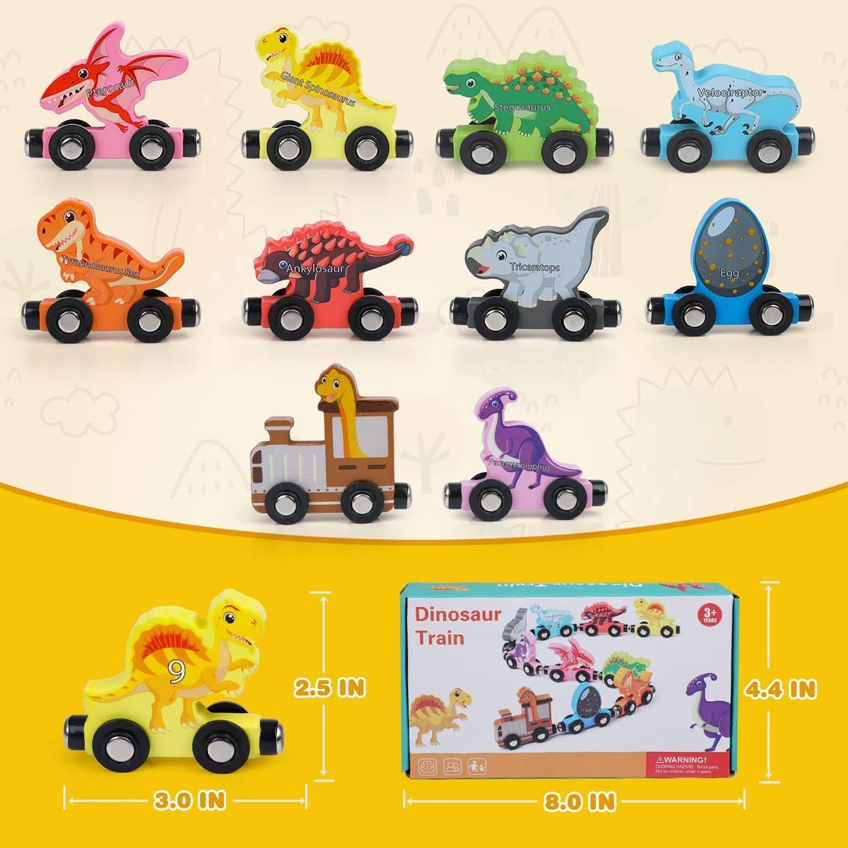 This is a magnetic wooden train set designed for toddlers and young children. Each carriage is shaped like a colorful dinosaur and is numbered, making it both fun and educational. The train cars connect via magnets, allowing children to easily assemble and rearrange them.