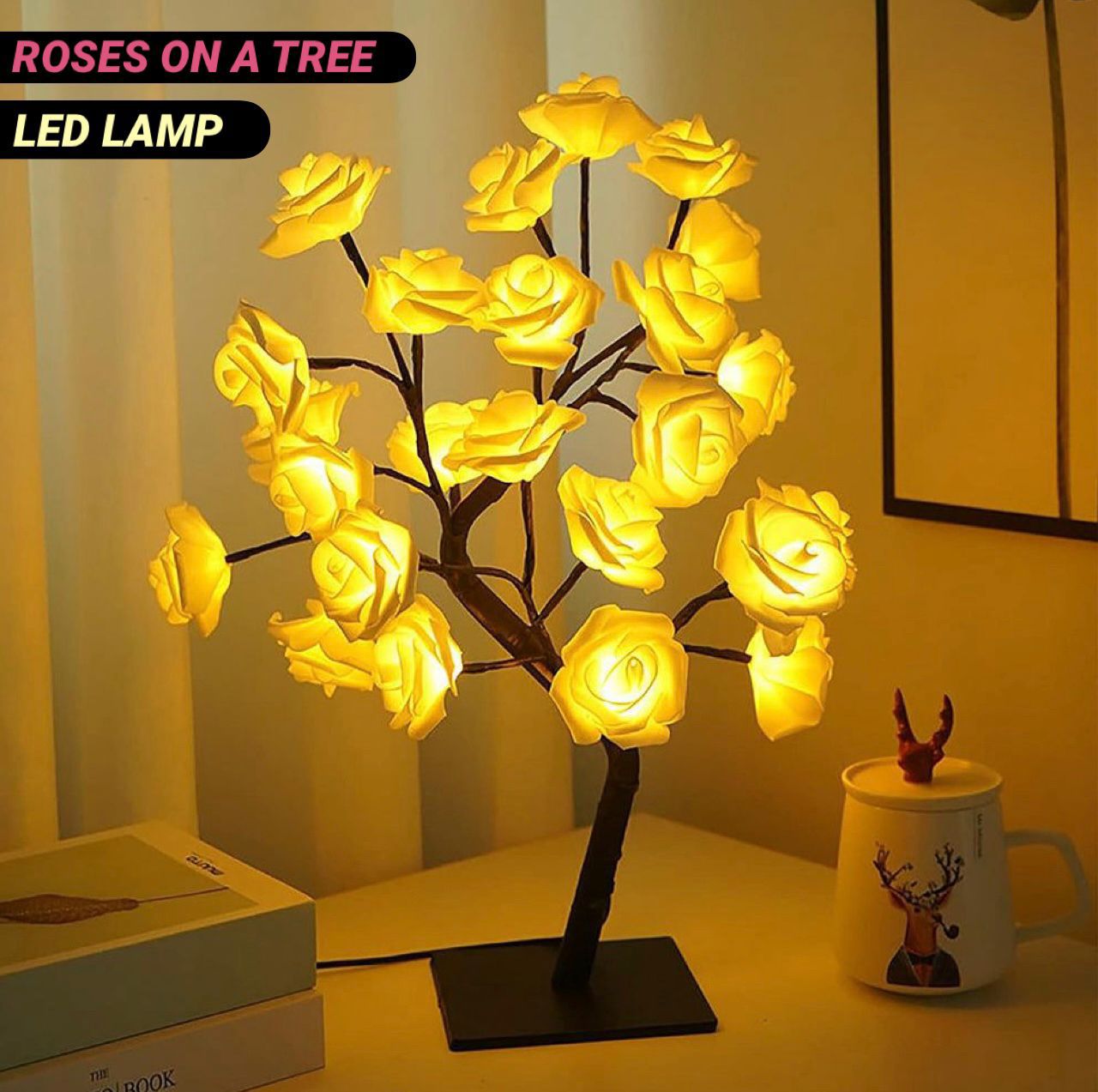 This is a decorative LED lamp designed to resemble a small tree with glowing rose-shaped flowers. The lamp features multiple flexible branches, each adorned with artificial roses that emit a warm yellow light when switched on. It is intended for indoor use as an aesthetic lighting piece.